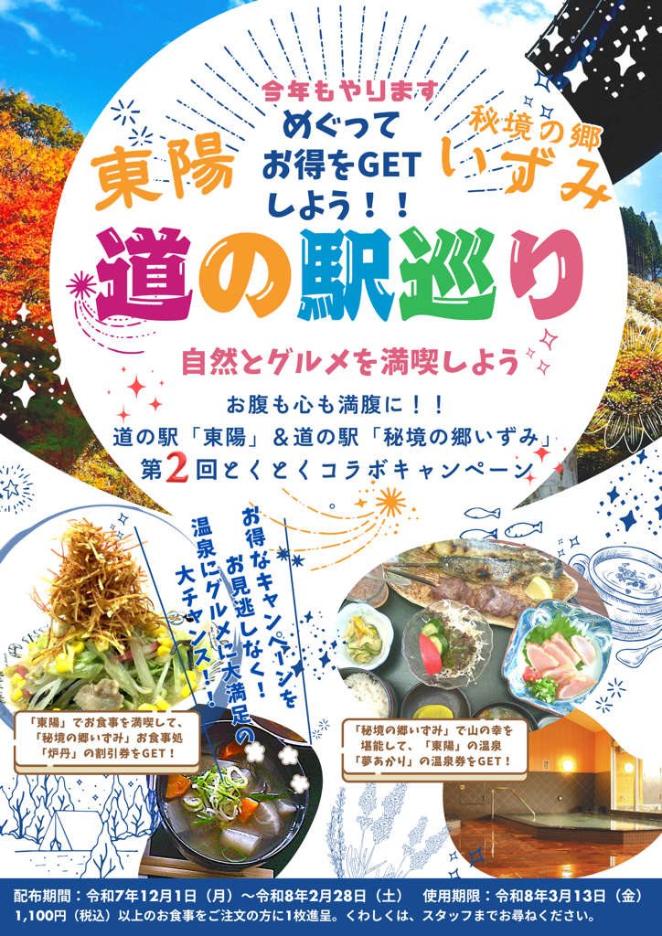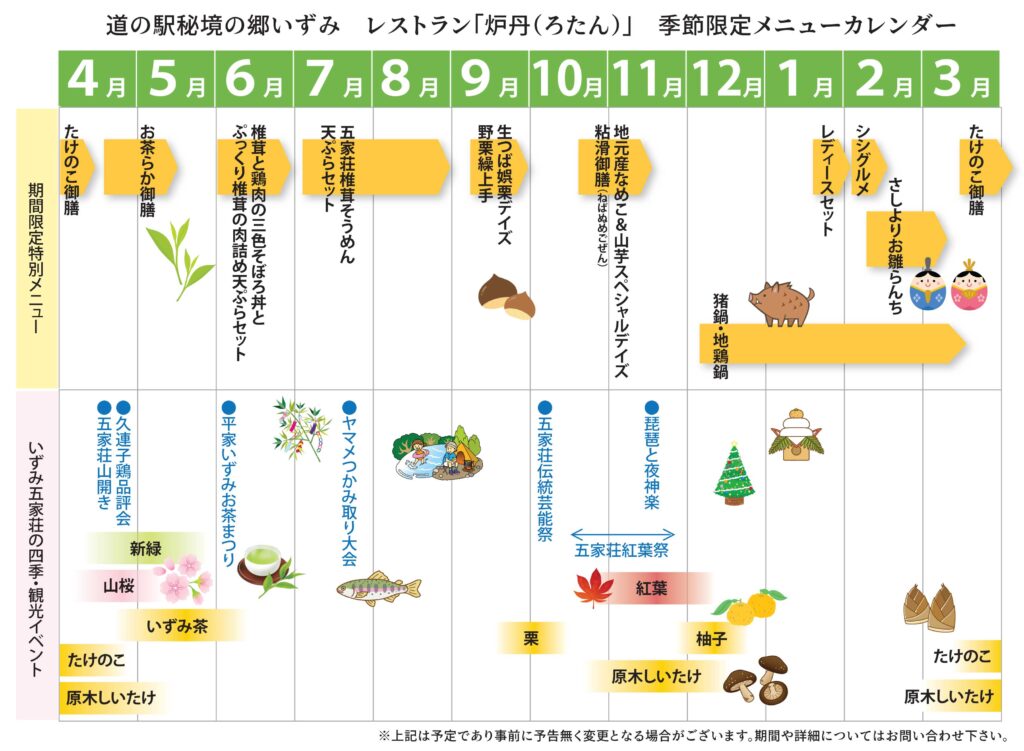 toppage 2022.12.162025.10.16 九州山地の山々に囲まれた道の駅季節の味とジビエが楽しめるお食事処「滋味健丈 炉丹」公式通販サイト リニューアルオープン地元の特産品、山の幸をご紹介人気の隠れ里の柚子こしょうシリーズ 地産食材を使った美味しいお食事 お食事処「炉丹」 泉町の特産品をお土産に 特産品ショップ「森の恵み」 会議やイベントに会場をお貸しします 貸会場情報 お知らせ&イベント 期間限定です!2026-01-06 道の駅巡り☆とくとくコラボキャンペーン!2025-12-01 1月の定休日のお知らせ2025-12-01 『お鍋いたします』!2025-11-29 レストラン特別メニューカレンダー2025-10-27 「いずみ茶」いかがですか‼2025-08-01 オンラインショップ