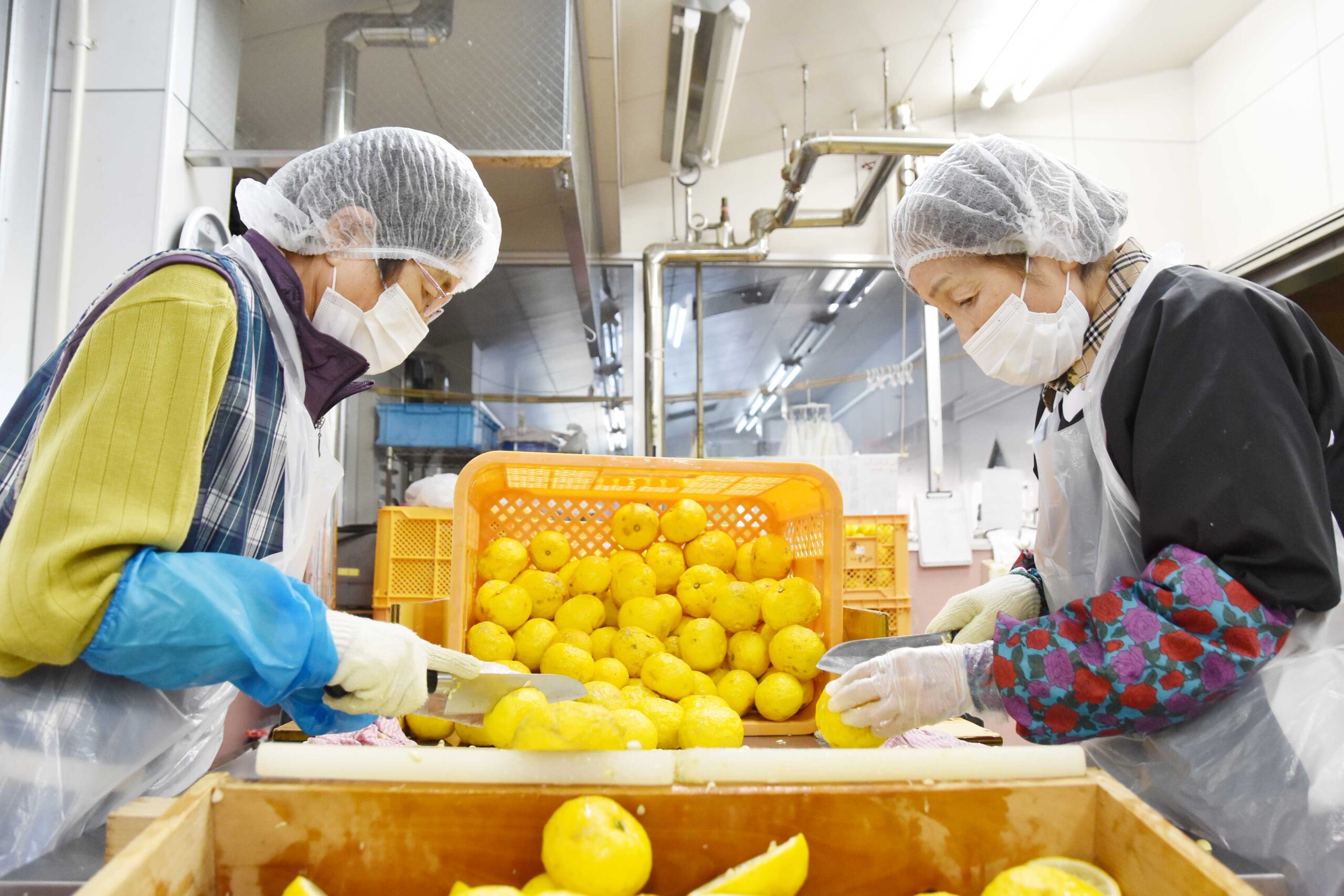 ゆずの実そのものが傷ついているわけではありませんが、加工所では果実の状態に合わせて「果汁のみ利用するもの」「果汁と果皮の両方を利用するもの」に分け、2週間程度の短い期間に1-2年間分の原材料の下処理をします。