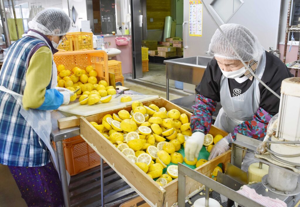 11月中旬から12月初めにかけて、今年最後の黄ゆずの搾汁作業を行いました。泉町産のゆずが今年はたくさん実りました。写真は昨年11月29日の柚子搾汁作業の様子です。
